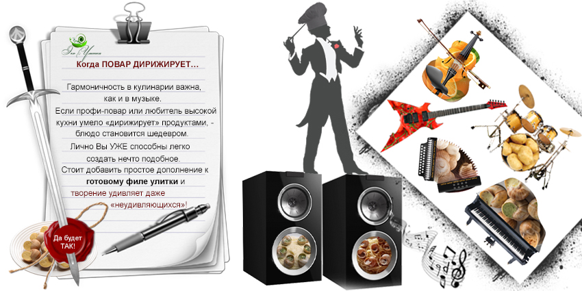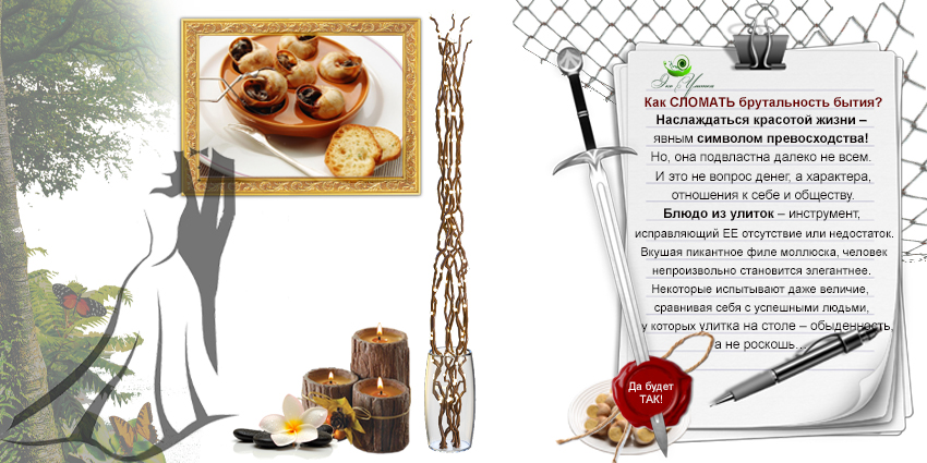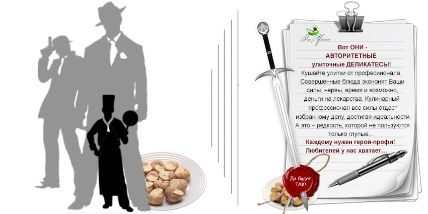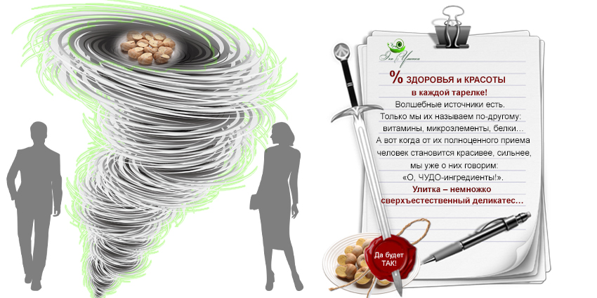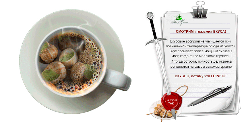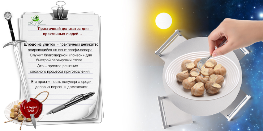 Каждое блюдо из улиток превращает прием пищи в маленький праздник. Причем в любой обстановке. Дом, офис, природа – места, где можно расслабиться вместе с улиточным деликатесом. Когда изящно достаешь нежную мякоть из ракушки двузубой вилкой (шпажкой, зубочисткой) – чувствуешь себя ЛИЧНОСТЬЮ, ДЛЯ КОТОРОЙ КРАСОТА ЖИЗНИ — НОРМА.