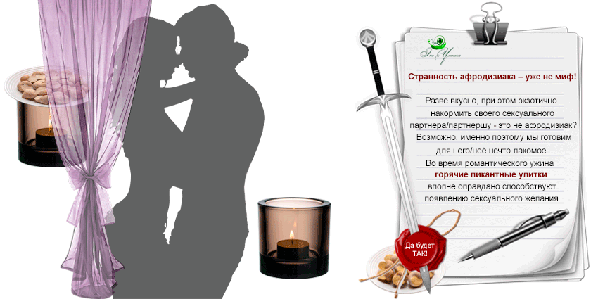 Мясо улиток – мощный афродизиак, увеличивающий половое влечение. В некоторых странах его называют «типичной мужской едой». Хотя на женщин его влияние идентично.
